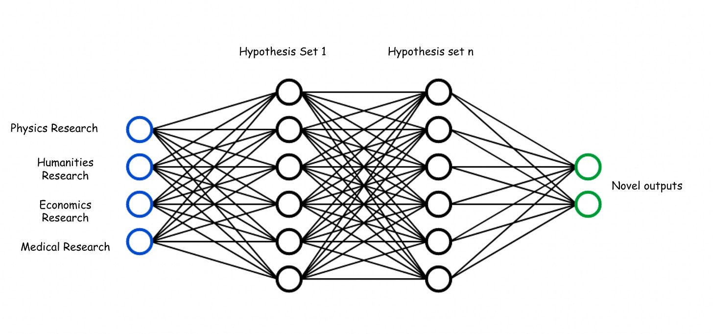 What if methods for new knowledge creation occurred in a manner similar to which a neural network operates? Two fields of knowledge are thrown in as inputs, with all pre-existing research and ideas comingling with one another to develop a massive array of potential hypotheses. Humans or agents can enter a marketplace to vote on the potential impacts of any given hypothesis, with those ‘winners’ being submitted for validation and testing in laboratories.