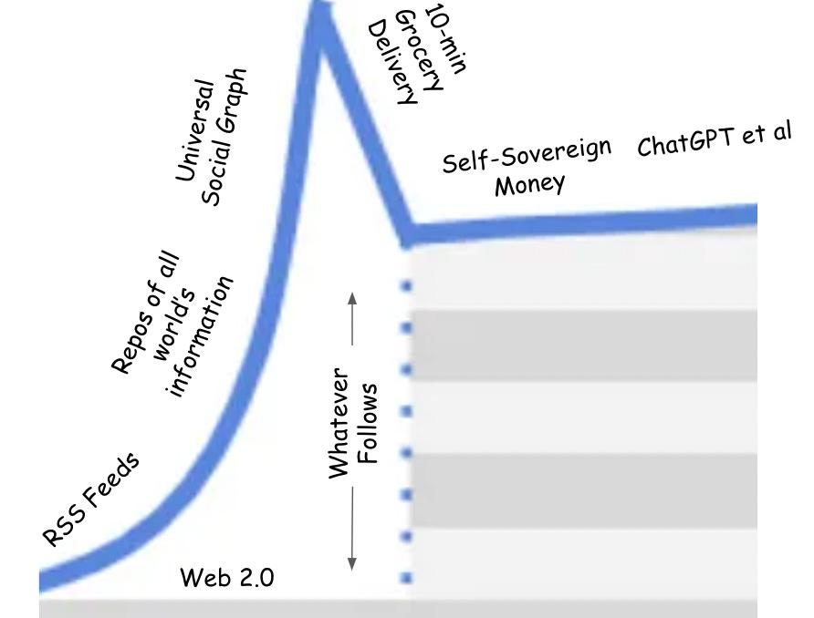 Once the capacity of the latest generation of productive assets to improve wellbeing has been exhausted, a new generation of idea takes its place and inspires new productive assets altogether (or vice versa). Intentionally or not, the curves in USV’s infrastructure framework provide an interesting way of observing this.