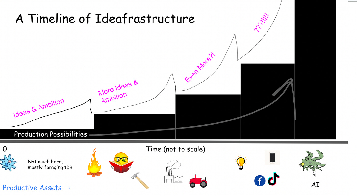 Ideas lay the groundwork for foundational changes in innovation cycles by enhancing our productive possibilities. In turn, improved production possibilities expand the ambition and scope of our ideas to drive even more advances in production and wellbeing.